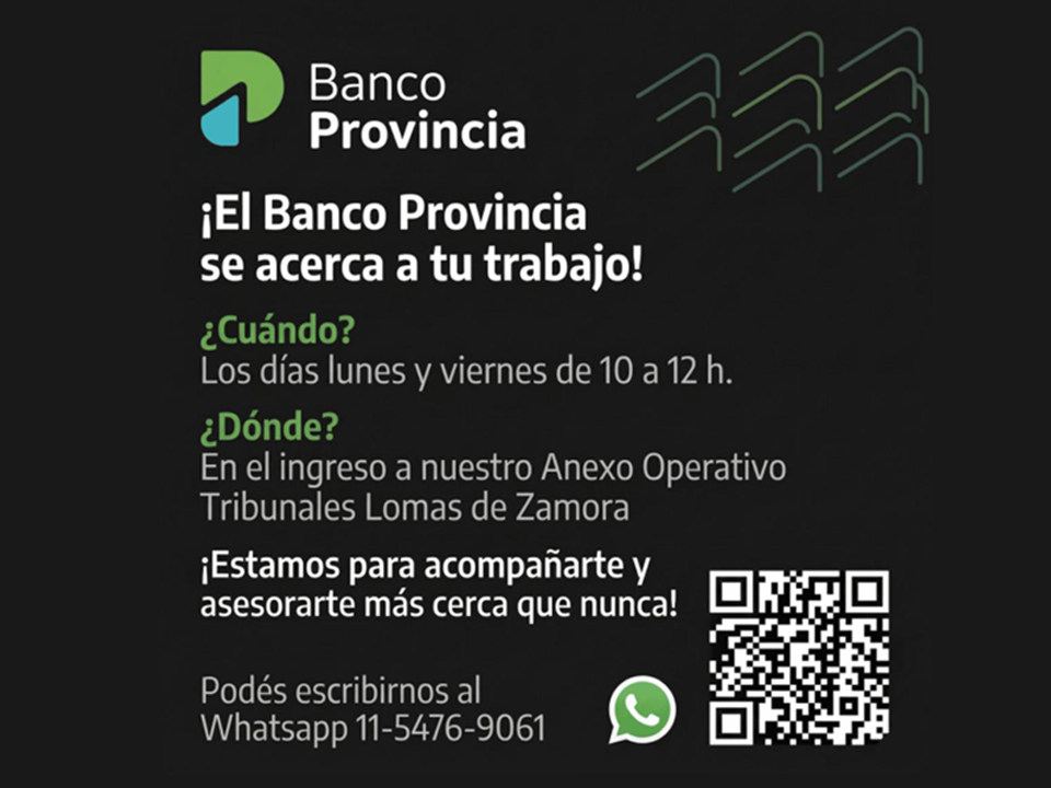 Desde este viernes 10 de abril personal del Banco de la Provincia de Buenos Aires se encontrará en Tribunales de Lomas de Zamora, y todos los lunes y viernes de 10 a 12 horas para asesorarte y acercar tus dudas.